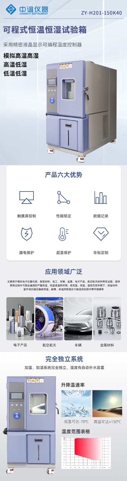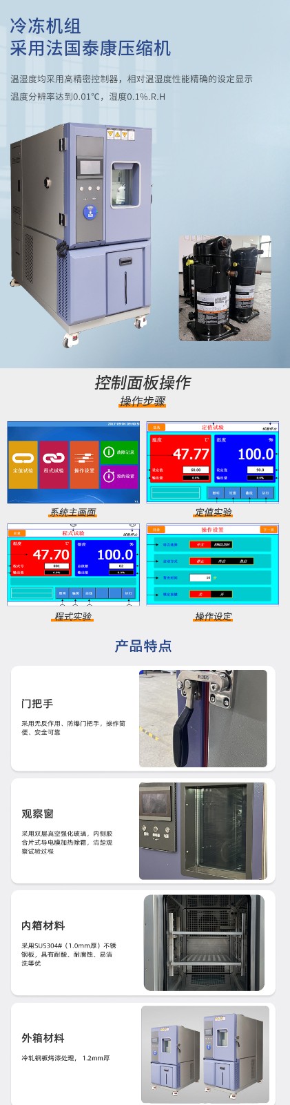 用于檢測(cè)材料在各種環(huán)境下性能的設(shè)備及試驗(yàn)各種材料耐熱、耐寒、耐干、耐濕性能,適用于電子、電器、通訊、儀表、車(chē)輛、塑膠制品、金屬、食品、化學(xué)、建材、醫(yī)療、航天等制品檢測(cè)質(zhì)量之用